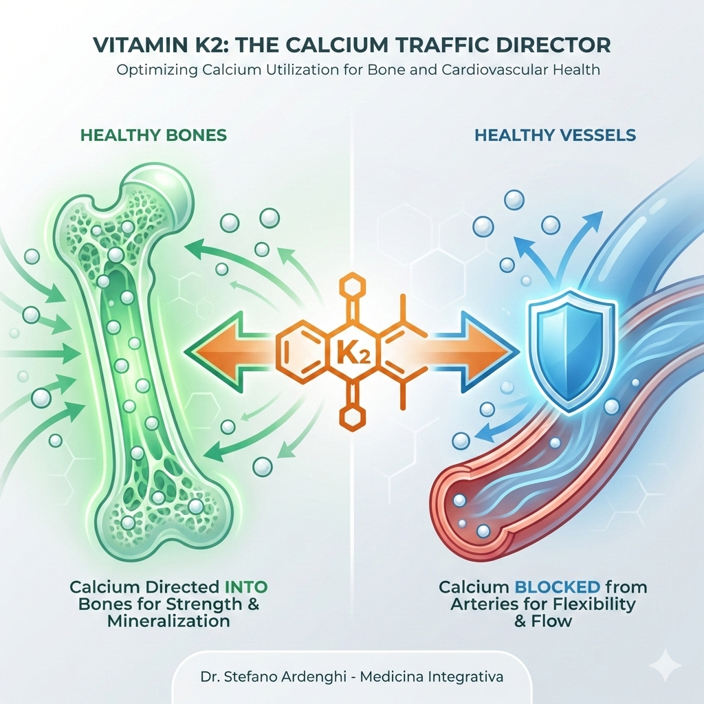 Scopri come la vitamina K2 dirige il calcio nelle ossa e lo tiene fuori dalle arterie. Prevenzione dell’osteoporosi e protezione cardiovascolare attraverso la medicina integrata.
